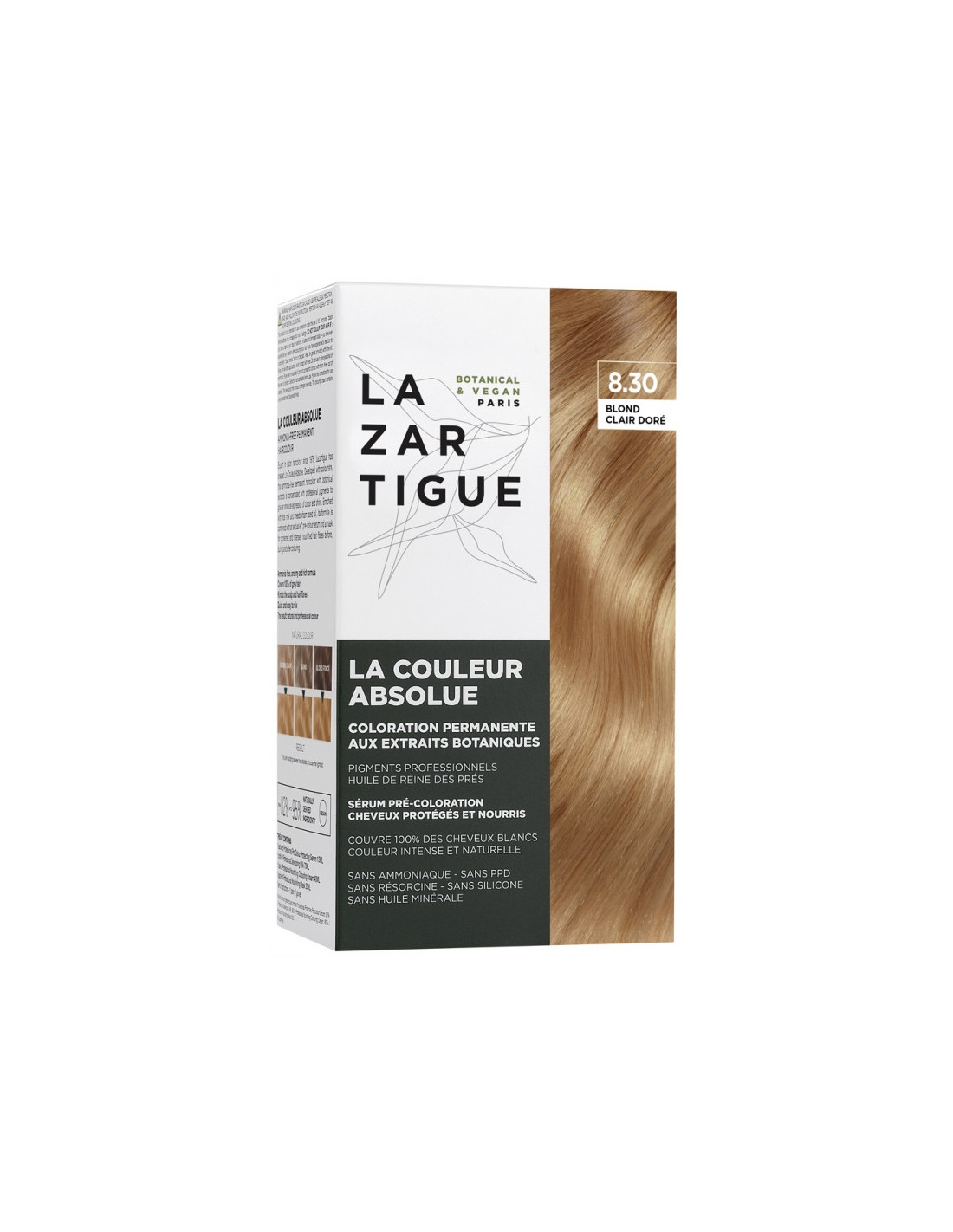 Lazartigue La Couleur Absolue - Coloration : 8.30 Blond Clair Doré est une coloration permanente aux extraits botaniques et concentrée en pigments professionnels pour une expression absolue de la couleur et de la brillance.Sa formule enrichie en lait de riz et huile de reine des prés est associée à un sérum pré-coloration et un masque exclusif pour une fibre protégée et intensément nourrie avant, pendant et après la coloration.