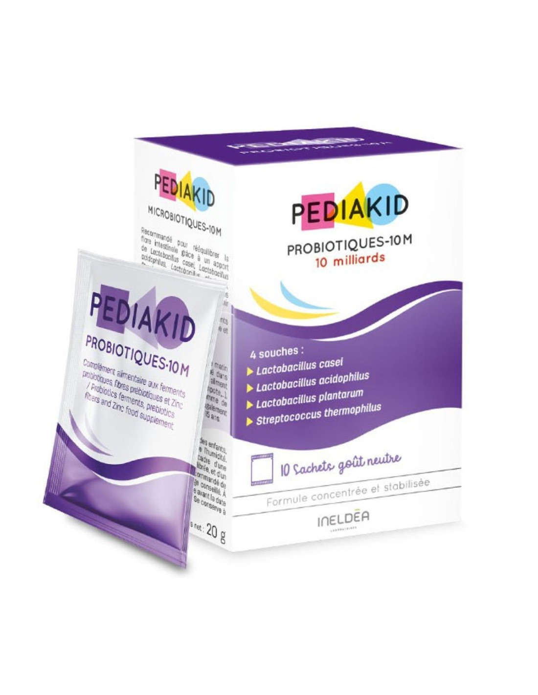 Pediakid Probiotiques-10 M sachets est un complément alimentaire aux ferments lactiques, fibres d'inuline de Chicorée et Zinc biodisponible, recommandé pour rééquilibrer la flore intestinale grâce à un apport de Lactobacillus casei, Lactobacillus acidophilus, Lactobacillus plantarum, Streptococcus thermophilus et de fibres d'inuline de chicorée et pour soutenir l'immunité grâce au Zinc.