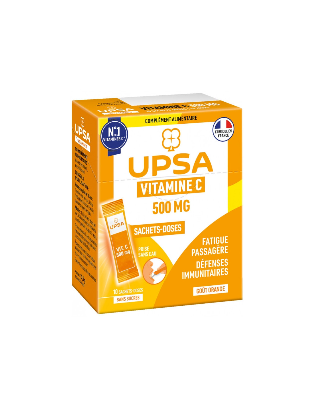 UPSA Vitalité Vitamine C 500 mg 10 Sachets est un complément alimentaire à base de vitamine C qui contribue à un métabolisme énergétique normal, à réduire la fatigue et est également reconnue pour contribuer au fonctionnement normal du système immunitaire.