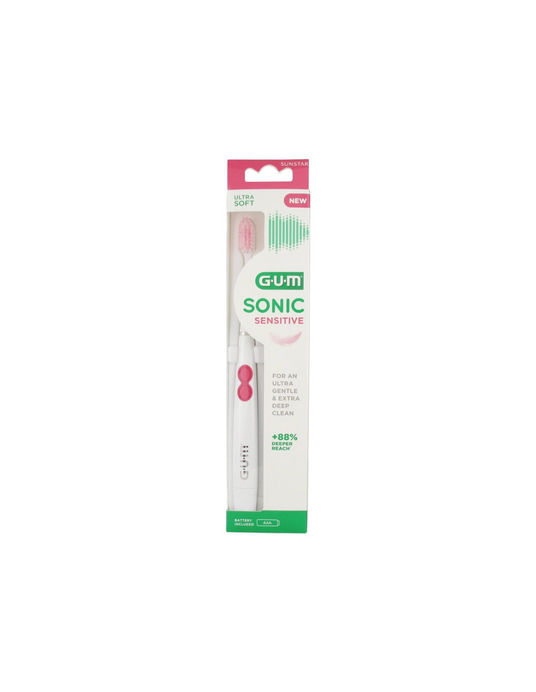 GUM Sonic Sensitive Brosse à Dents Ultra Souple 4101 est une brosse à dents sonique à pile aux brins ultra souples. Elle permet un nettoyage ultra doux et en profondeur là où la plaque s'accumule. Elle élimine la plaque dentaire 88% plus en profondeur dans les zones difficiles d'accès.