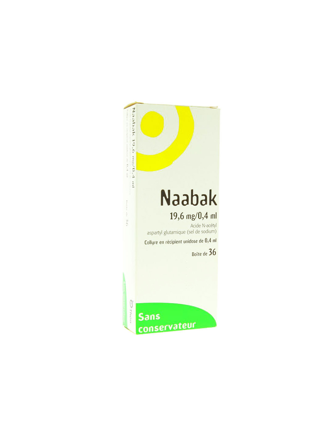 - Nutilisez jamais NAABAK 19,6 mg/0,4 ml, collyre en récipient unidose dans les cas suivants :· si vous êtes allergique (hypersensible) à lacide N-acétyl-aspartyl-glutamique ou à lun des autres composants contenus dans NAABAK, collyre.EN CAS DE DOUTE, IL EST INDISPENSABLE DE DEMANDER L'AVIS DE VOTRE MEDECIN OU DE VOTRE PHARMACIEN